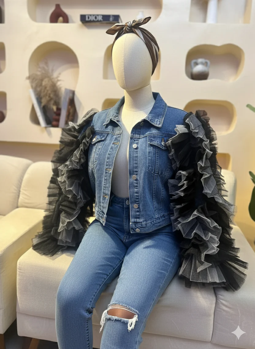 Make a bold fashion statement with this designer denim ruffle jacket—a fusion of edgy and chic. The layered tulle sleeves add dramatic flair to the timeless denim design, giving it a modern and luxurious twist. Perfect for pairing with jeans, skirts, or dresses, this piece brings runway confidence to your everyday style.